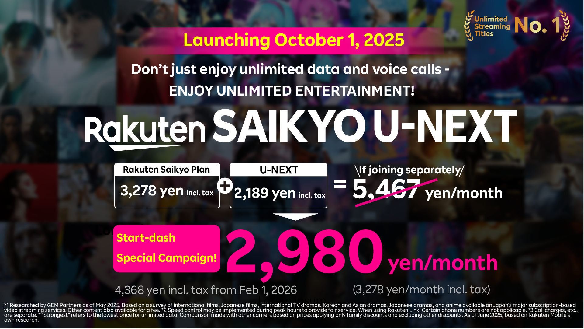 Tokyo, September 30, 2025 – Rakuten Mobile, Japan’s newest and most modern mobile network, today announced the launch of Rakuten Saikyo U-NEXT on the Rakuten Mobile official website and at Rakuten Mobile stores starting at 6 p.m. on October 1, 2025.*1 To commemorate the launch of the new plan, subscribers who sign up between October 1, 2025, and January 31, 2026, will be able to access Rakuten Saikyo U-NEXT at a promotional rate of 2,980 yen per month (3,278 yen including tax) throughout the campaign period.*2