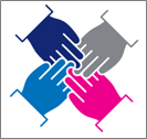 The logo incorporates the corporate colors of NTT, KDDI, SoftBank and Rakuten Mobile within its four-hand design. These hands, overlapping and converging at the center, symbolize the unified effort of the four companies working toward a shared objective.