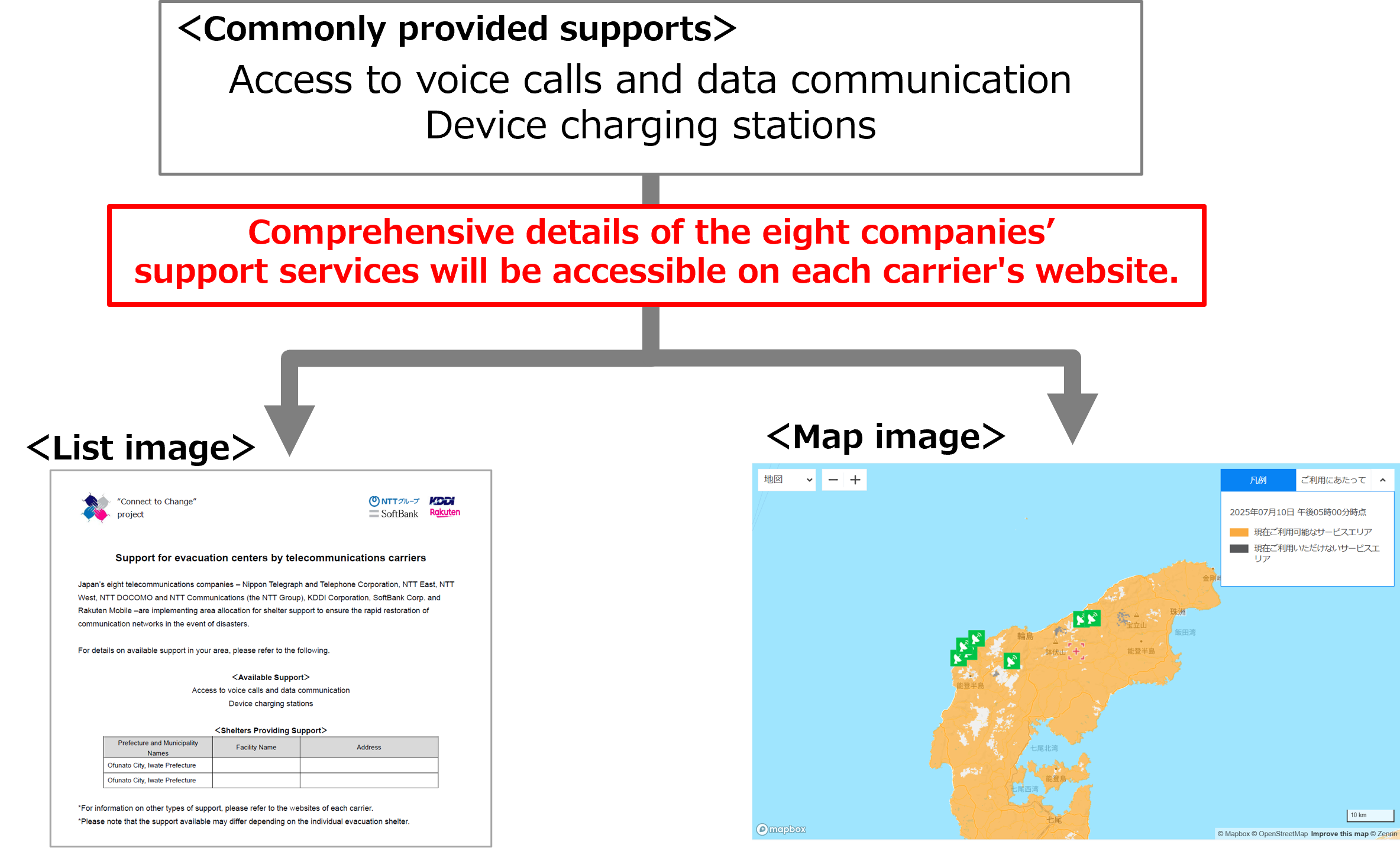 Tokyo, October 22, 2025 – Japan’s eight telecommunications companies – NTT, Inc., NTT EAST, NTT WEST, NTT DOCOMO and NTT DOCOMO BUSINESS (the NTT Group), KDDI Corporation, SoftBank Corp. and Rakuten Mobile – today announced the implementation of area allocation for evacuation shelter support and the standardization of an information dissemination system starting October 22, 2025. These measures, complementing the cooperative information-sharing system launched in early July 2025*1, are being implemented by the companies with the aim of further expediting support for disaster-affected areas during large-scale disasters.